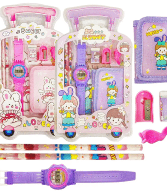 7 Pcs Stationery Set Toy for Kids – School Supply Kit with Pencil, Eraser, Sharpener, Wrist Watch and Purse – Birthday Return Gift – Color and Design As Per Stock