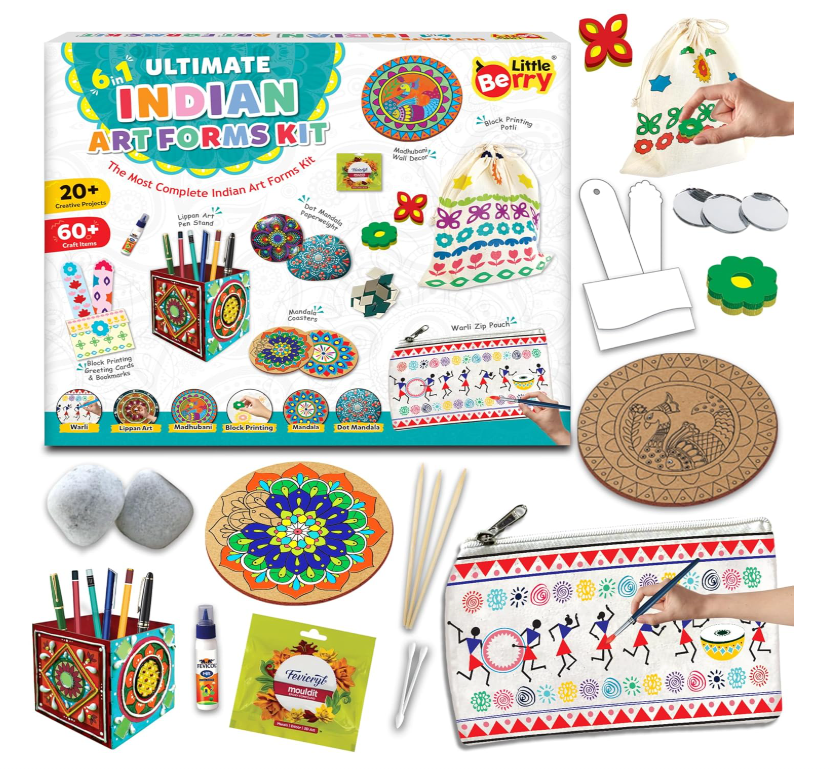 Little Berry Indian Art Forms Kits | Paper, Wood Ultimate 6 in 1 DIY Art & Craft Kit for Kids | Create 20+ Projects | Learn Lippan, Warli, Block Printing, Mandala & Madhubani Painting Kit | DIY Toys