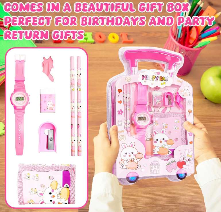 Case Creation Kids Stationery Gift Set 7 Pieces Includes School Supply 2 Pencil, 1 Pencil Gripper, 1 Eraser, 1 Sharpener, 1 Wrist Watch,1 Wallet in Trolley Design Case, Birthday Return Gift – Girls