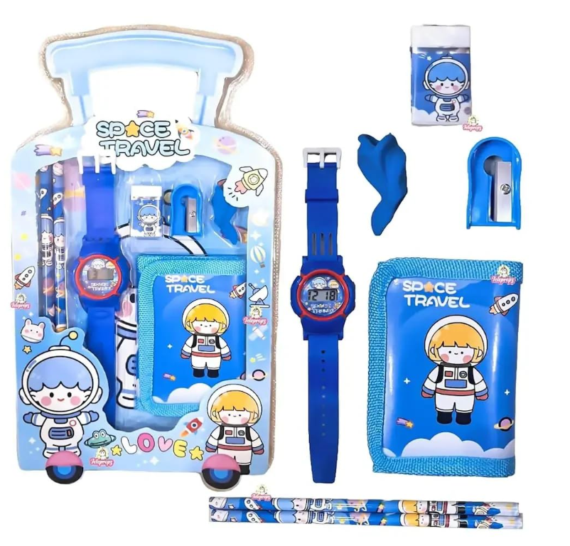 Case Creation Kids Stationery Gift Set 7 Pieces Includes School Supply 2 Pencil, 1 Pencil Gripper, 1 Eraser, 1 Sharpener, 1 Wrist Watch,1 Wallet in Trolley Design Case, Birthday Return Gift – Boys