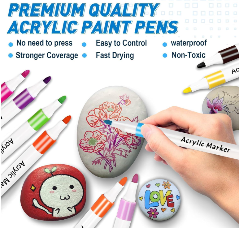 - Versatile Acrylic Paint: These markers are filled with high-quality acrylic paint that is suitable for a variety of surfaces, including canvas, rocks, paper, wood, glass, and more. Their versatility makes them ideal for both traditional and unconventional art projects.