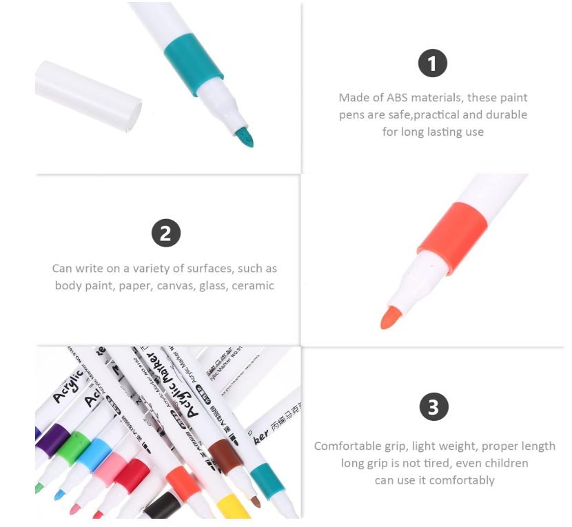 - 12 Vibrant Colors: The “Acrylic Marker Pens” set comes with 12 rich and vibrant colors, offering a wide range of options for your artistic creations. These colors allow you to express your imagination and bring your ideas to life.