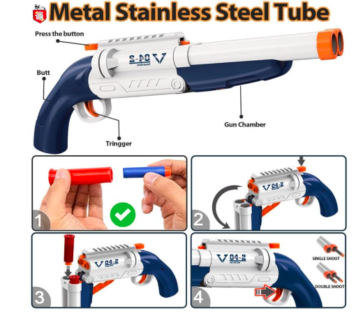 EASY TO LOAD: The ejecting shotgun is easy to use. You only need 3 quick steps to load. First, open the barrel by pressing the button. It is very important that you need to fold the barrel completely (about 90 degree).Second, load the shells with darts into the barrel. Third, closed the barrel. Finally, pull the trigger.