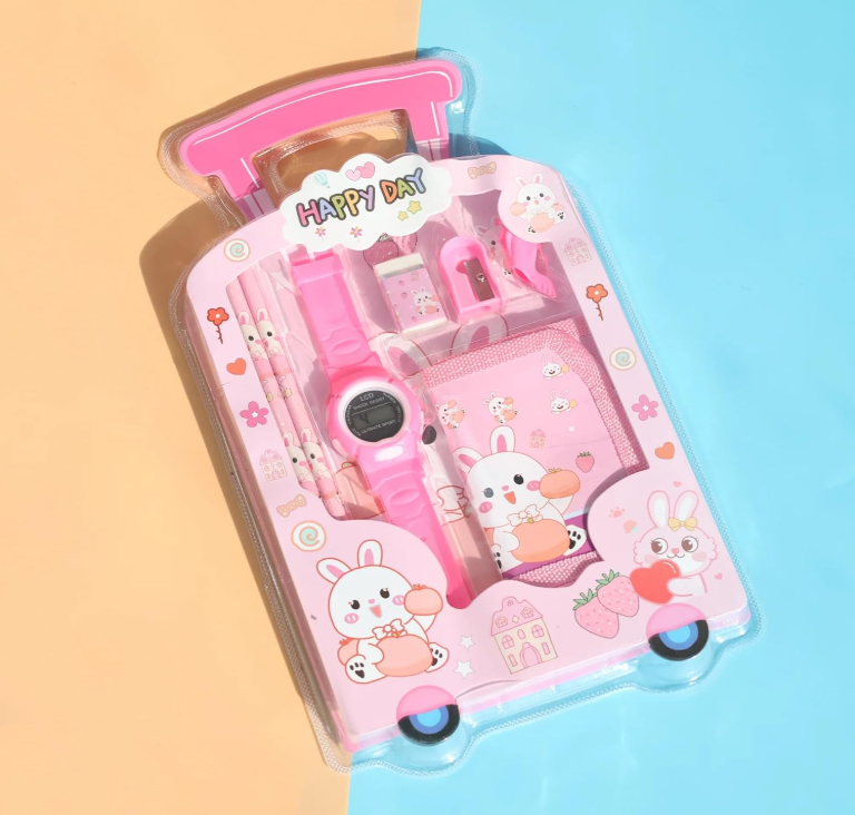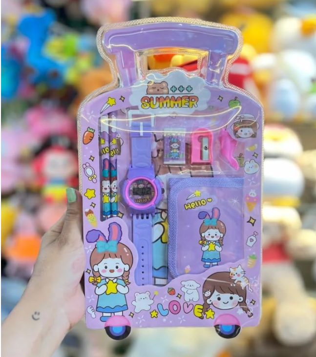 - COMPLETE SET: 7-piece stationery set includes digital wrist watch, wallet, 2 pencils, pencil gripper, eraser, and sharpener packed in an attractive trolley-style case