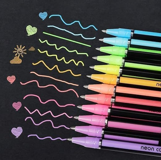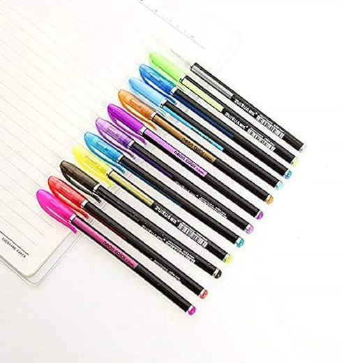 Buy set of 12 neon Glitter gel pens. These pens give metallic view when writing and suitable for writing and other art & craft purposes.